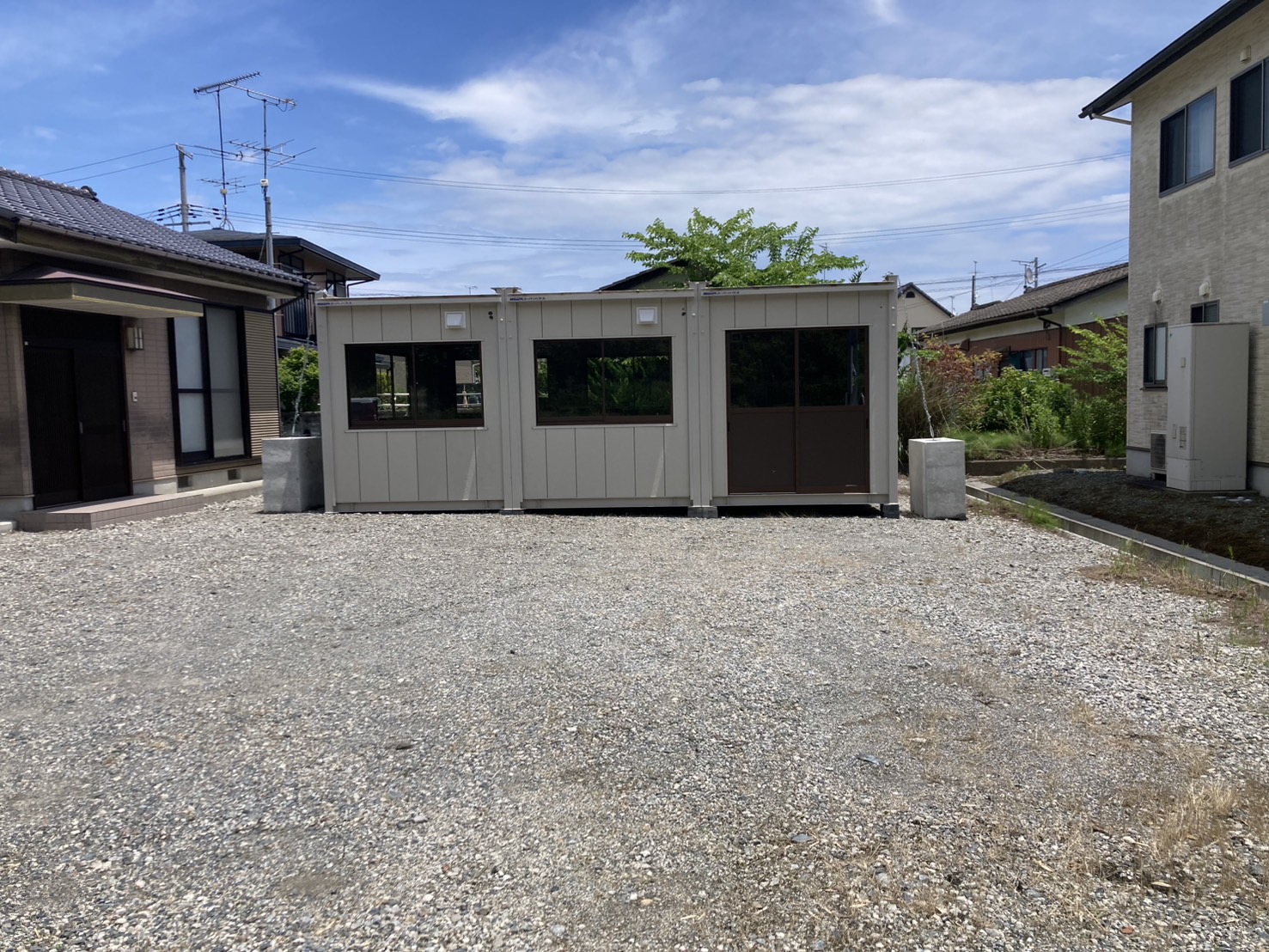 広い敷地内に突如として登場したプレハブが存在感を出しています。